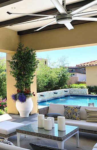 Weatherproof ceiling fan installation for patios, verandas, and covered outdoor areas, using IP-rated fans designed to withstand the elements.